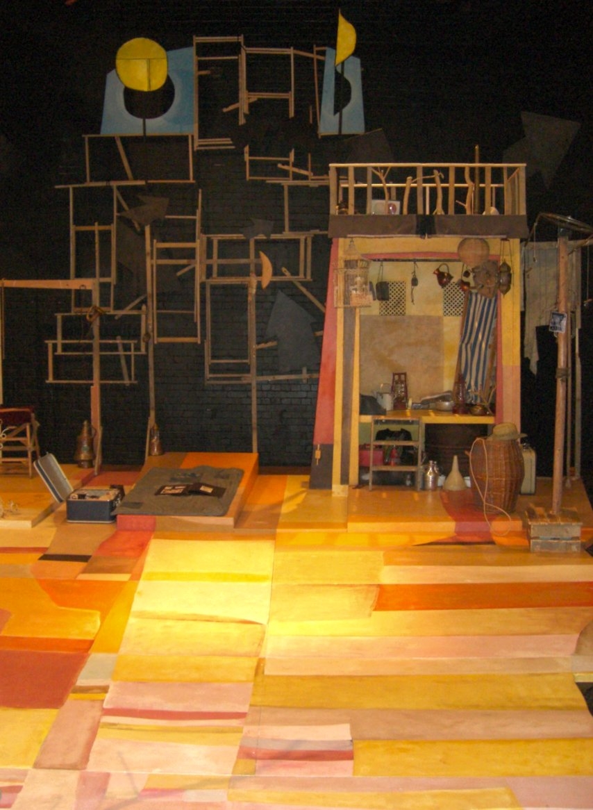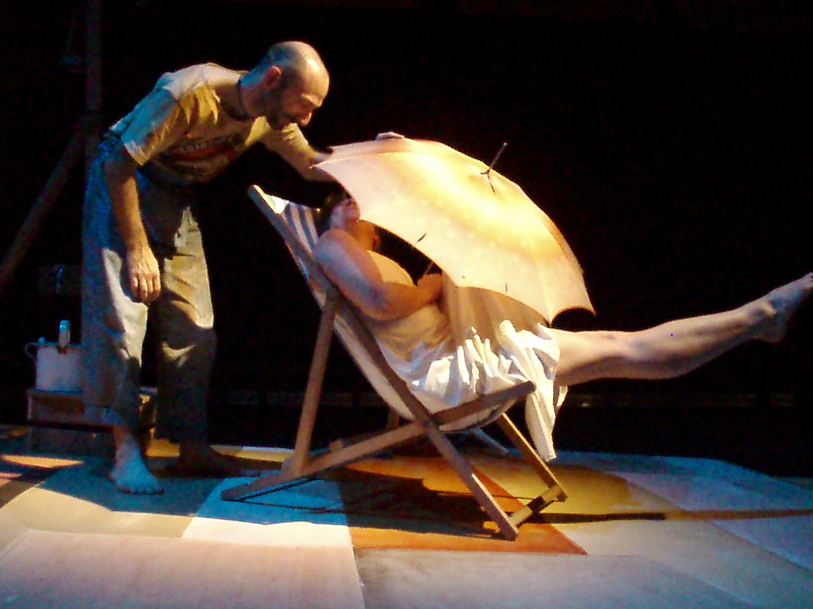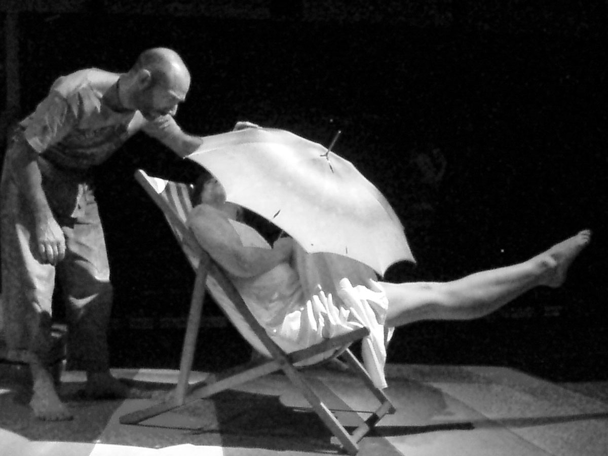 Something about these images chimed exactly with things we had been discussing that morning and, so, when my director asked what design ideas I was toying with my reply was immediate. The pictures were passed around the room and Paul Klee has remained with us ever since. Due to some physical considerations, gravity for example and the need to house three actors and a musician we have had to chop and re-arrange some images - but the essence remains. Copies of paintings have been 'scaled up' to fit our performance space and, somehow, this has always been a rather neat fit. Every time we sought a solution to some scenic problem Klee seemed to be there. There were three possible shapes for the forestage and, again, the key was in another Klee painting (see 'Highway and Byways 1929). He seems to have entered our subconscious. We were discussing an opening image for 'Bliss' and we liked the idea of the girl on the deckchair covered by a parasol. Half an hour later I found the Klee sketch 'Young Woman In A Deck Chair' (1909), sure enough, covered by a parasol. I'd like to think he is with us. I hope he likes it and we humbly dedicate it to the man. I'd like to think he has been with us and is happy with what we have done with his paintings.
