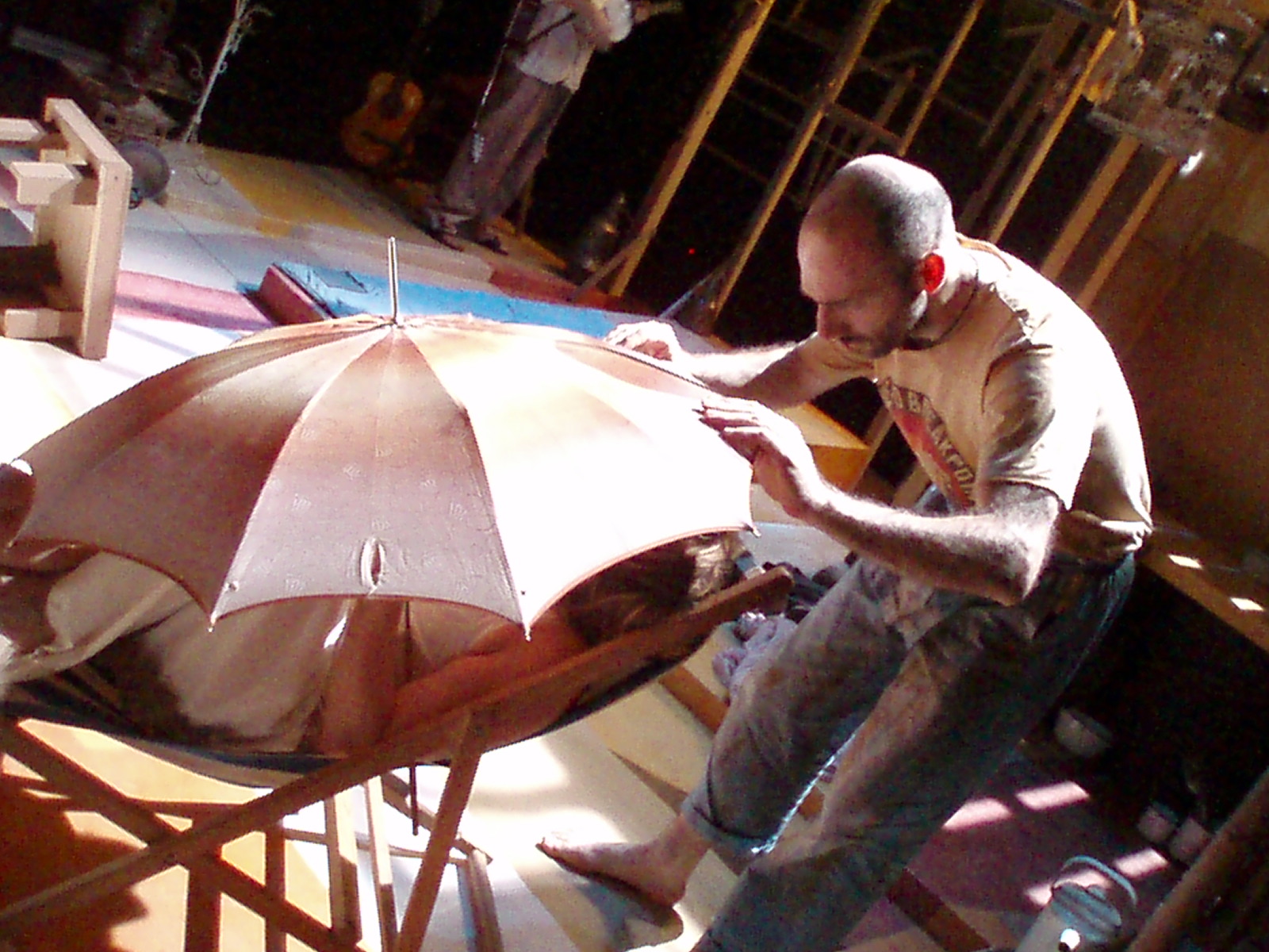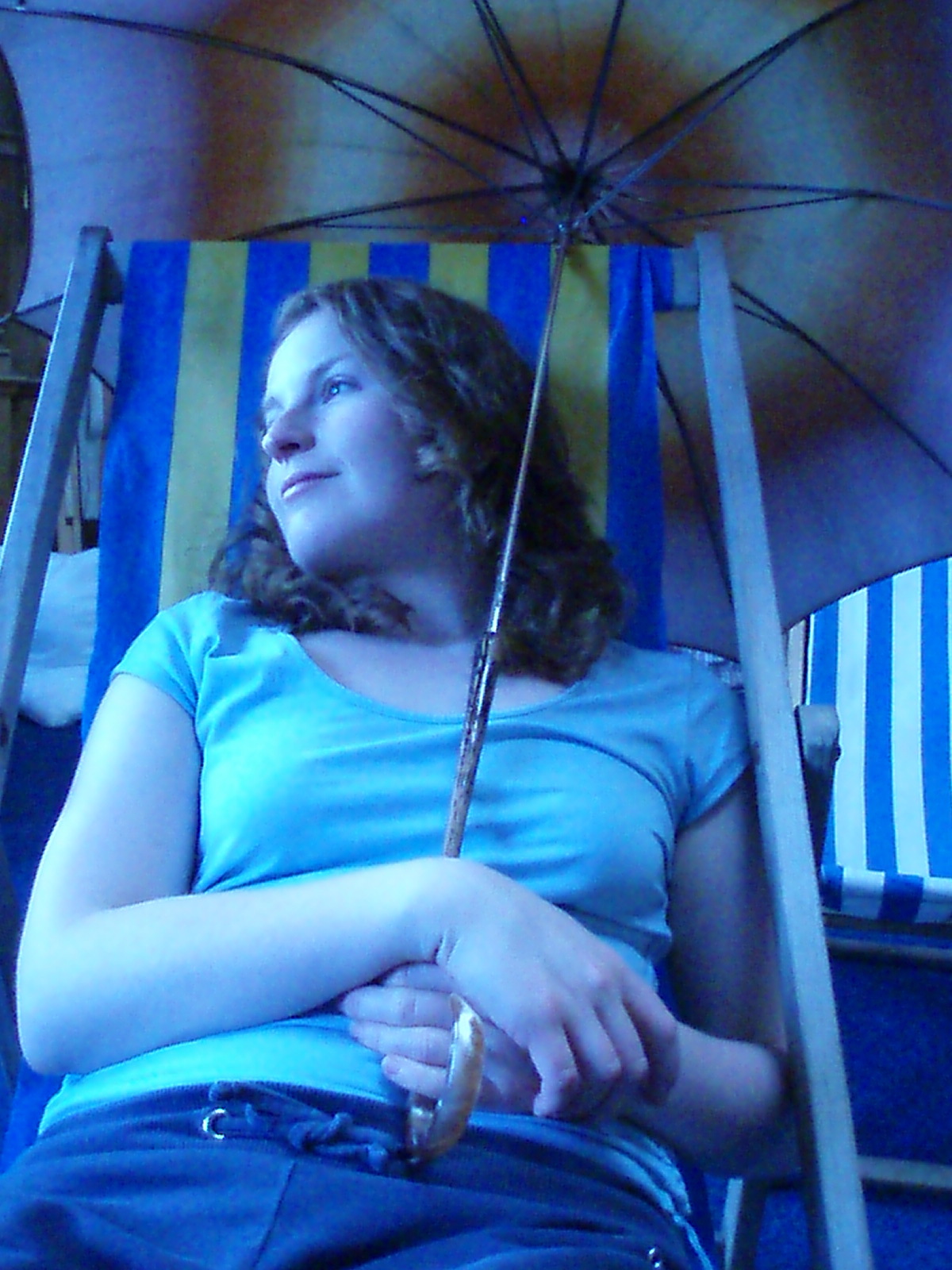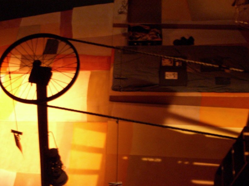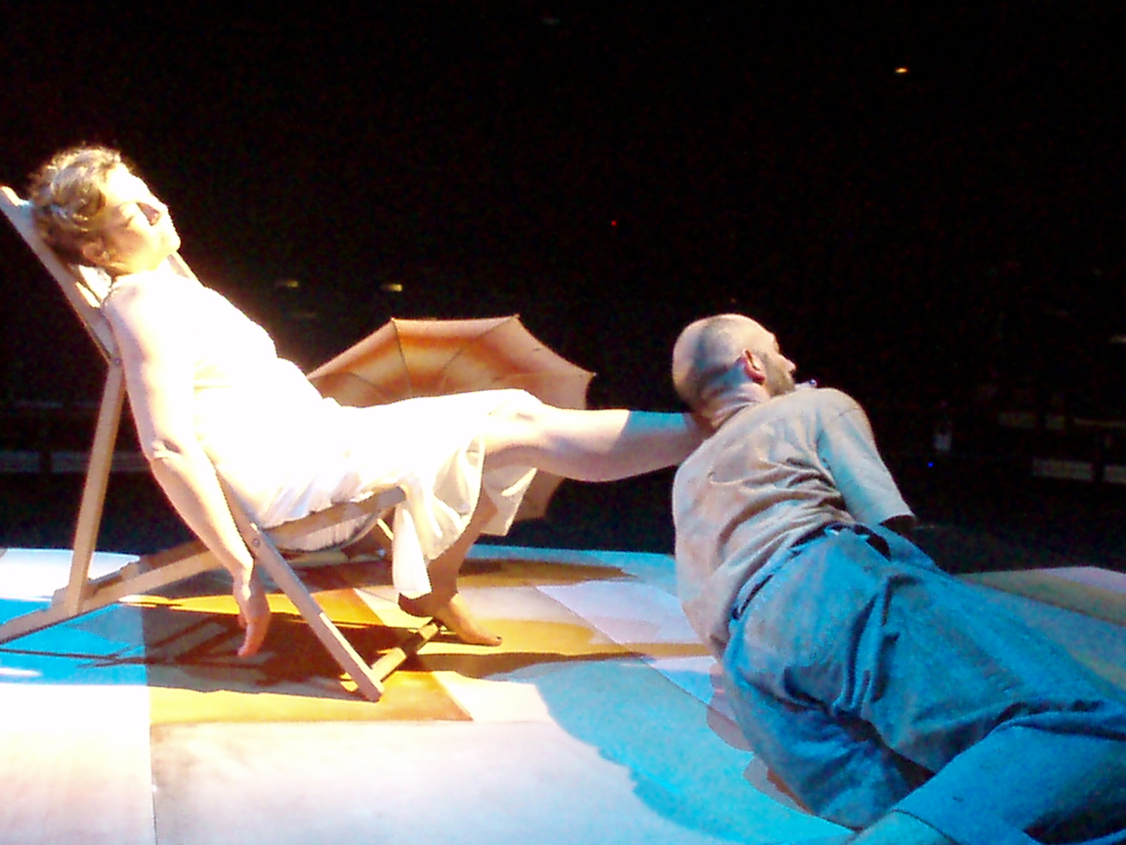 Something about these images chimed exactly with things we had been discussing that morning and, so, when my director asked what design ideas I was toying with my reply was immediate. The pictures were passed around the room and Paul Klee has remained with us ever since. Due to some physical considerations, gravity for example and the need to house three actors and a musician we have had to chop and re-arrange some images - but the essence remains. Copies of paintings have been 'scaled up' to fit our performance space and, somehow, this has always been a rather neat fit. Every time we sought a solution to some scenic problem Klee seemed to be there. There were three possible shapes for the forestage and, again, the key was in another Klee painting (see 'Highway and Byways 1929). He seems to have entered our subconscious. We were discussing an opening image for 'Bliss' and we liked the idea of the girl on the deckchair covered by a parasol. Half an hour later I found the Klee sketch 'Young Woman In A Deck Chair' (1909), sure enough, covered by a parasol. I'd like to think he is with us. I hope he likes it and we humbly dedicate it to the man. I'd like to think he has been with us and is happy with what we have done with his paintings.
