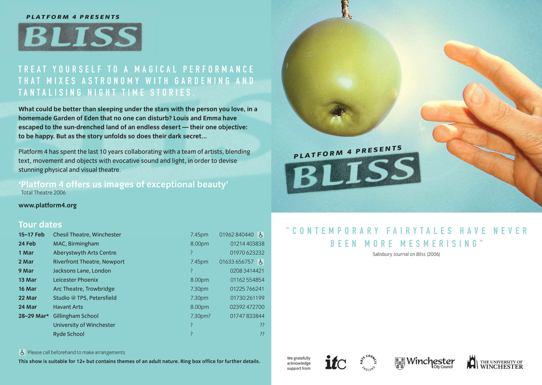 "Contemporary fairytales have never been more mesmerizing than Winchester based Platform 4's production Bliss, previewed at Salisbury Playhouse last week.