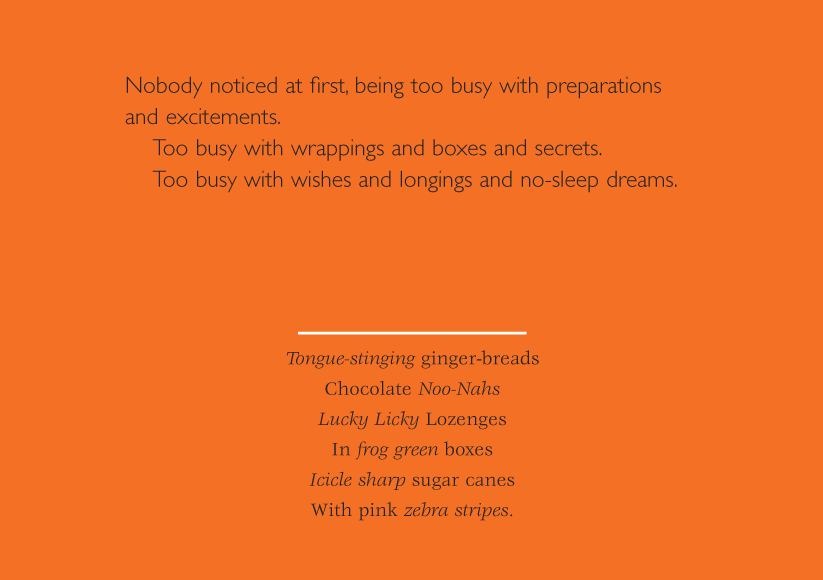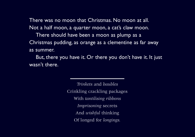 Words by Anna Maria Murphy, Writer and Poet & Images produced during a Multi Sensory Christmas Installation project created by designers and performers from Platform 4 with the help of hearing children and children with hearing difficulties aged 7-11 years in association with The Drill Hall and supported by John Lyon's Charity.